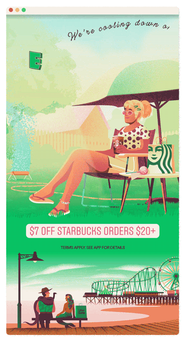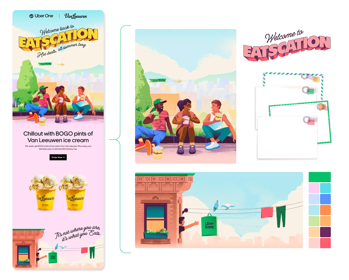 With so many brand partners to showcase, we leaned into illustration to create visual consistency, control, and a cohesive summer feel. Each piece includes a subtle Uber Eats moment alongside elements of each restaurant’s brand— small slices of summer Eats life. The work showed up across social, email, and in-app.